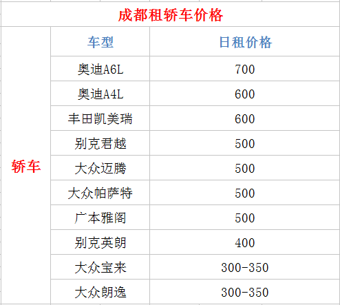 以上就是成都轎車租賃比較常見的幾種車型及日租價格表,僅作參考,成都租轎車價格如遇節假日,價格將上浮。反正越臨近節假日,車型越緊張,價格自然越高,如果提前預定的話,一般可以享受日常租車價格,如果租期長的話,優惠幅度更大。