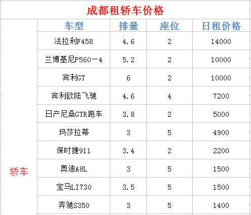 現在成都市面上租車公司是越來越多啦,提供的車型也越來越豐富。就轎車而言,高、中、低檔車型都有,因此現在很多人都愿意租賃轎車使用,靈活方便選擇還多。既然租賃轎車的好處那么多,那么自然租賃價格也是大家特別關注的事情,成都租車公司轎車日租價格是多少呢?